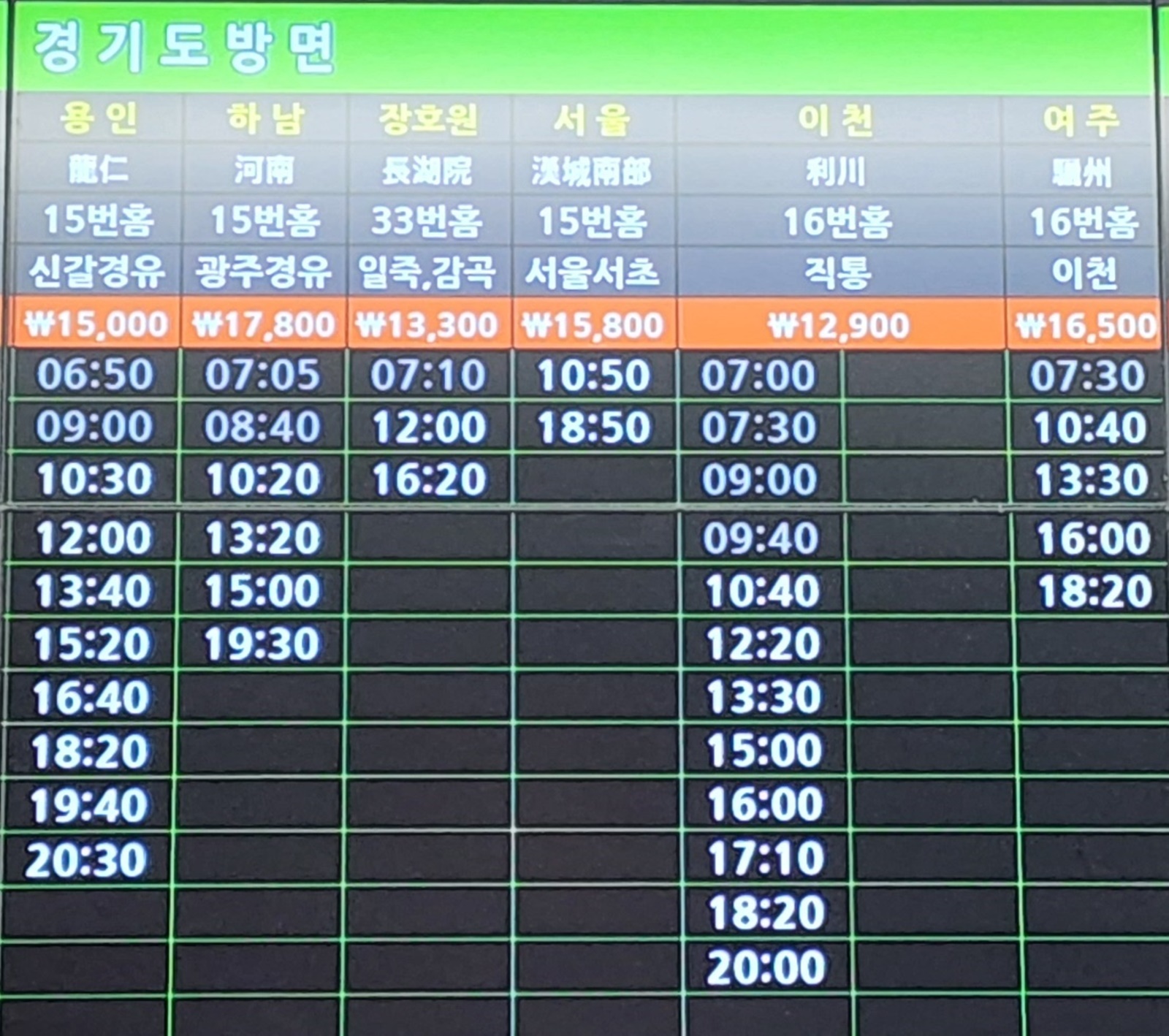 대전 출발 용인, 하남, 장호원, 서울, 이천, 여주 방면.