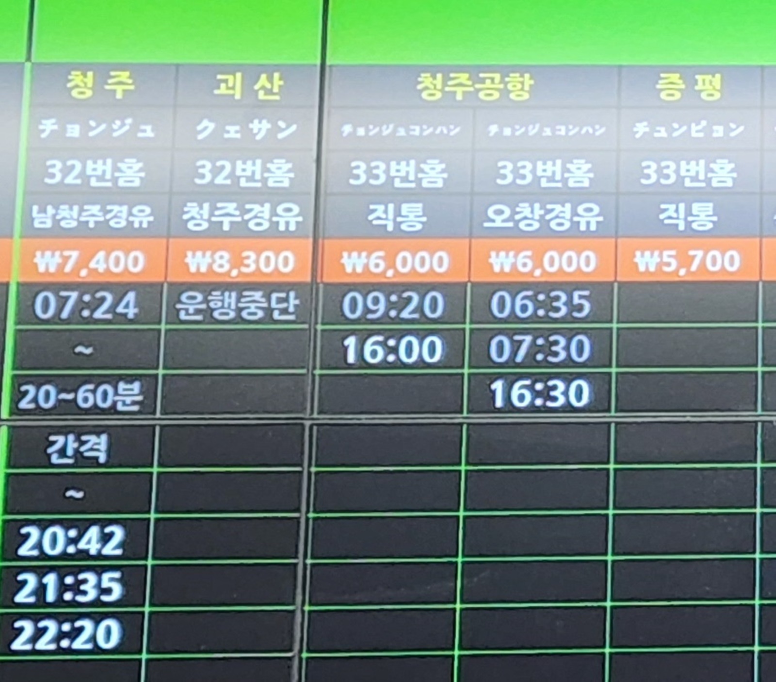 대전 출발 청주, 괴산, 청주공항, 증평 방면.