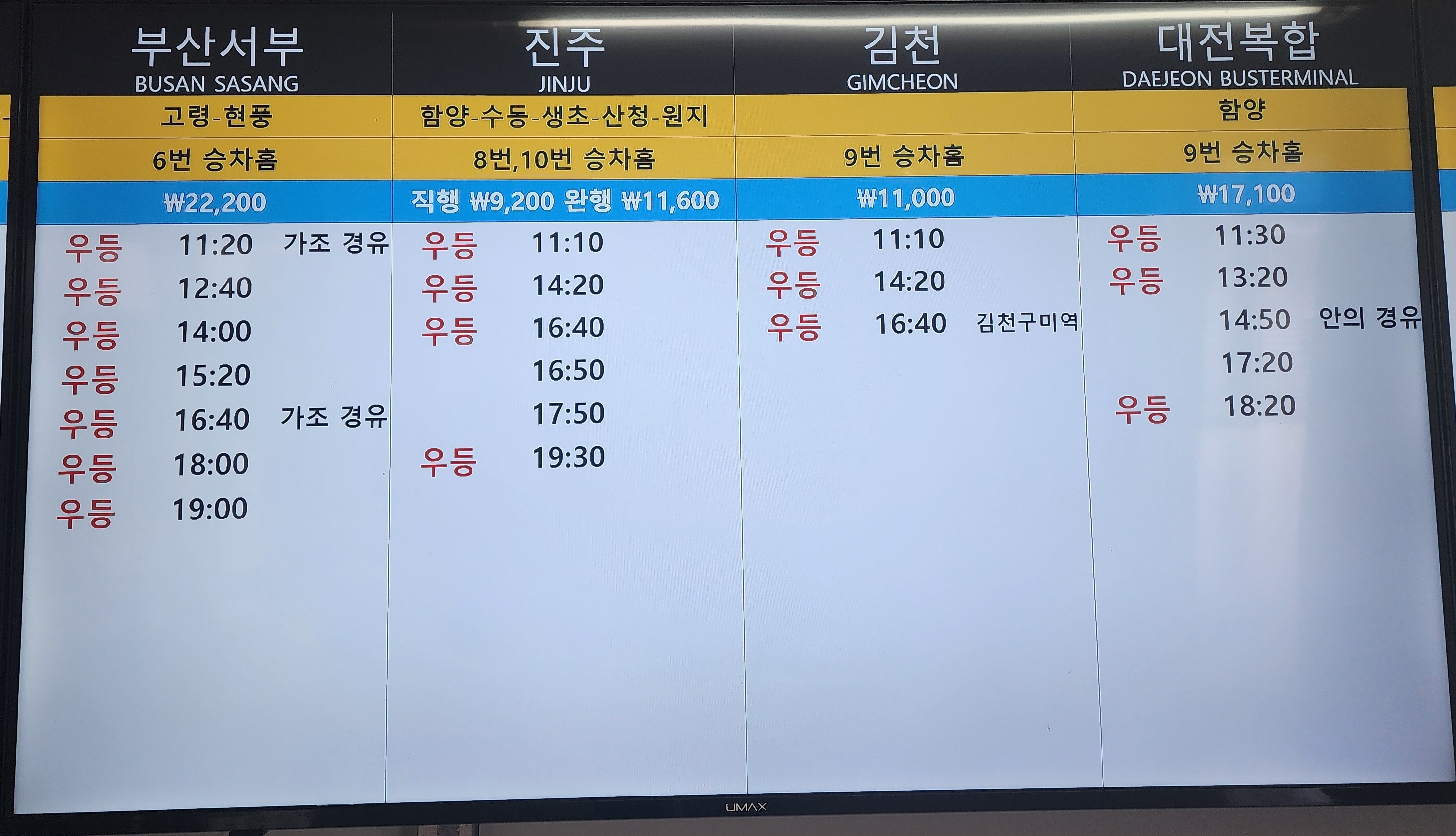 거창 출발 전주, 광주 유스퀘어, 대구 서부, 함양 방면.