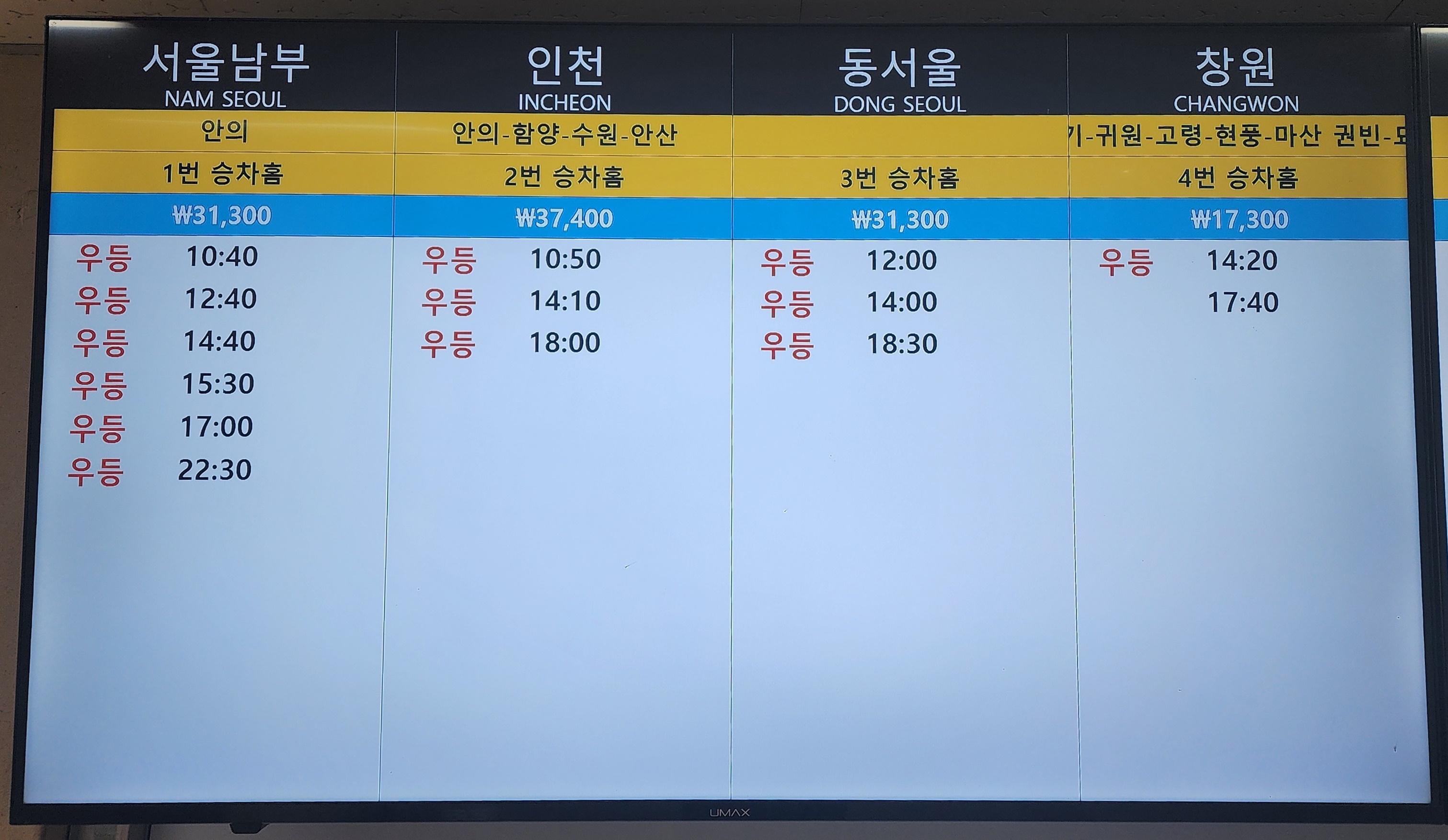 거창 출발 서울 남부, 인천, 동서울, 창원 방면.